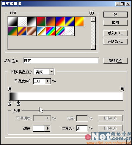 26、选择工具箱中的“渐变工具”,单击其属性栏,进入简便编辑器,设置参数如图37所示,渐变色黑色到白色,单击确定。