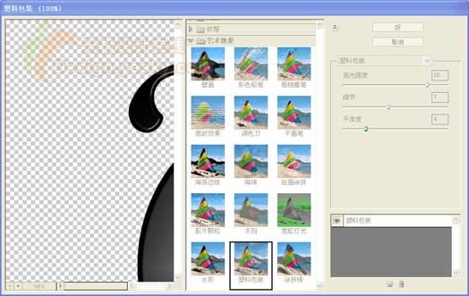 16、执行菜单栏中的“滤镜”“艺术效果”“塑料包装”命令,在弹出的“塑料包装”对话框中设置高光强度为16,细节为7,平滑度为4,如图19所示,