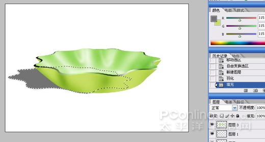 40、这里要说明一下,盘子的材质为半透明的塑料。盘身部分是透光的,而盘沿部分则透光性稍差。分析过后,继续刻画。将投影外缘作为选区载入后,缩小移动到如下状态,羽化较多像素。并删除,露出白色。