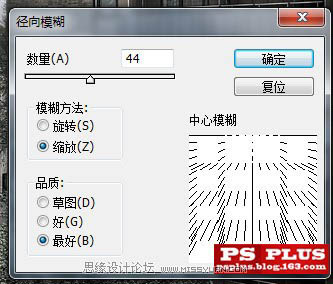 > 模糊 > 径向模糊。需要说明的是。模糊的数量越大。光线的长度就越大。模糊中心就是光线散发的中心。
