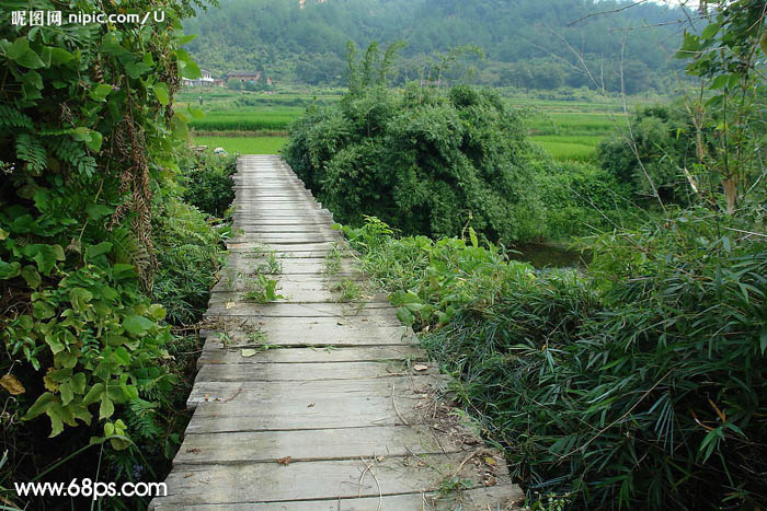 + T 右键变形,适当调整好大小,然后抠出木板路,图层混合模式改为“叠加”,然后添加投影效果,参数设置如下图。