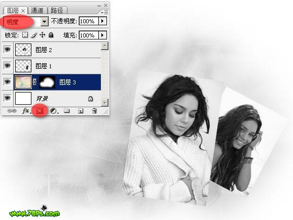 2、再把下面的素材图拖进去,把它放在背景图层上面,混合模式为明度。然后添加一个蒙版,在蒙版上擦除2张人物照片。