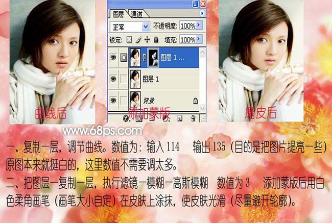 2、把副本复制一层,执行:滤镜 > 模糊 > 高斯模糊,数值为3,确定后按住Alt键加上图层蒙版,用白色柔角画笔在皮肤上涂抹,使皮肤光滑。