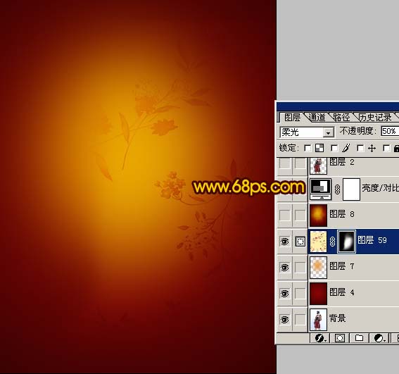 3、打开下图所示的素材,拖进来,把图层混合模式改为“柔光”,图层不透明度改为:50%,加上图层蒙版把边角部分擦掉,如图6。