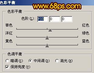+ B调整色彩平衡,参数设置如图11,效果如图12。