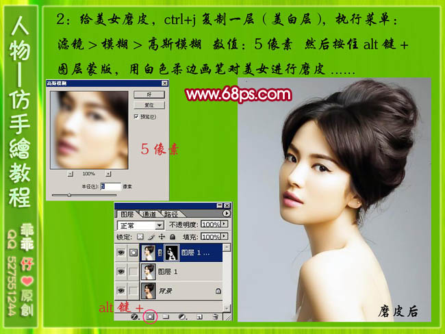 + J把刚才盖印图层复制一层,执行:滤镜 > 模糊 > 高斯模糊,数值为5,然后按住Alt键加图层蒙版,用白色柔边画笔对美女进行磨皮,具体方法如下图。