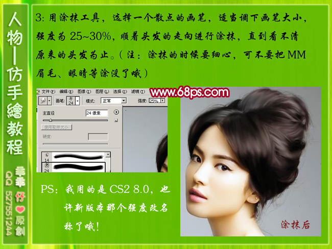 3、新建一个图层,盖印图层,选择一个散点的画笔,适当调下画笔大小,强度为:25-30%,顺着头发的走向进行涂抹,直到看不清原来的头发位置。