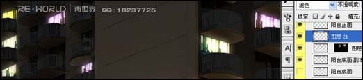 24、接下来制作住宅楼的内透,这个内透我也是找素材。抠下来,用(CTRL+T)变换来调整透视,用色相/饱和度(CTRL+U)来调单个内透的颜色,让它们看上去不是那么一样,然后内透整体复制一层,高斯模糊5左右,图层属性我选择滤色模式,这样感觉有一层柔柔的光线照出来,如图: