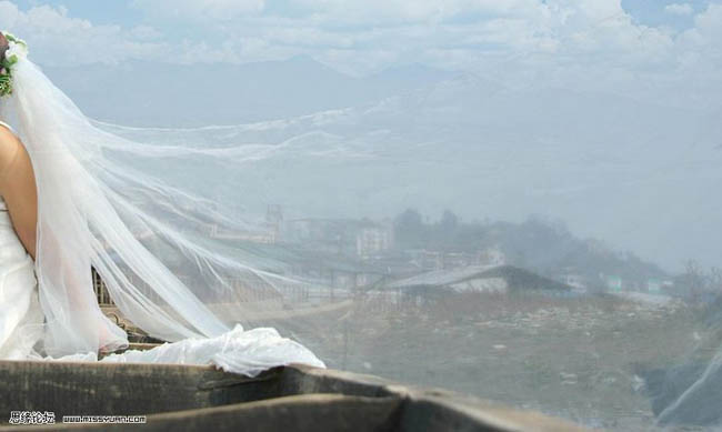 5、打开下图纱纹素材,用通道抠图法把纱纹部分抠出来,然后把抠出的纱巾去色,然后拖到刚才操作的婚片图层里面,摆好位置,加上图层蒙版用黑色画笔擦掉不需要的部分,图层不透明度改为:90%,复制一层图层混合模式改为“正片叠底”。