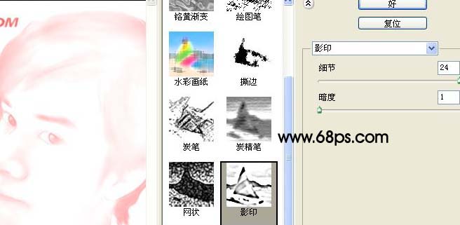 2、执行:滤镜-素描-影印,细节24,暗度1,确定后,按Ctrl + Shift + U去色。用套索工具,把图中的文字部分选出来,填充白色(去掉文字)。