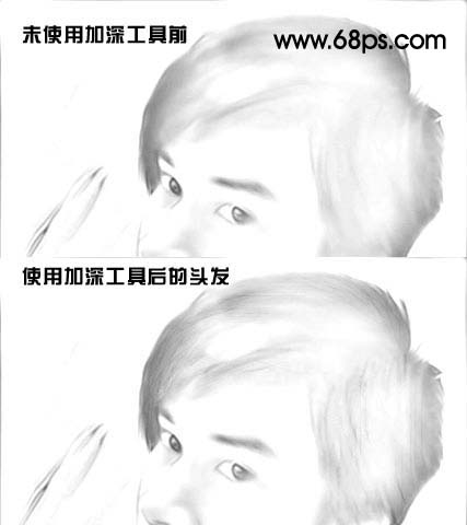 4、新建图层,按Ctrl+alt+shift+e盖印图层,用直径2,暴光度48%的加深工具,加深出头发一根根的线感,如图。