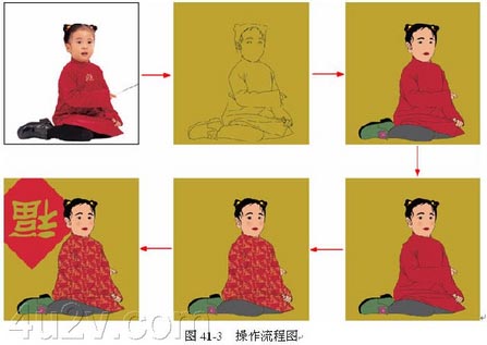 先使用【钢笔工具】勾出人物的轮廓,选择【描边路径】为人物上线稿,再运用【魔棒工具】为人物上色,使用【图案生成器】创建衣服的花纹,最后用【横排文字工具】和【矩形工具】添加背景,整个操作流程图如图 41-3 所示。