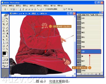 (2) 勾选路径。选择【钢笔工具】沿头发的边沿勾选出路径,并把它命名为头发。同样使用【钢笔工具】将身体的不同部分勾选出路径,并把他们进行命名,如图 41-4 所示。
