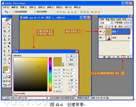 (4) 创建背景。点击【创建新的图层】按钮,新建【图层 1 】,设置【前景色】参数并填充图层,如图 41-6 所示。