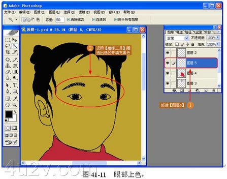 (9) 眼部上色。新建【图层 5 】,使用【魔棒工具】圈选眉毛和眼珠部分并填充颜色,如图 41-11 所示。