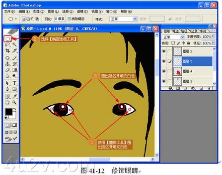 (10) 修饰眼睛。使用【魔棒工具】选取眼白部位的选区并填充白色,选择【椭圆选框工具】为眼睛添加反光点,如图 41-12 所示。