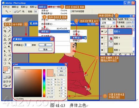 (11) 身体上色。使用【魔棒工具】圈选出身体区域的选区,点击【选择】|【修改】|【扩展】命令,把选区扩展,设置【前景色】并填充选区,如图 41-13 所示。