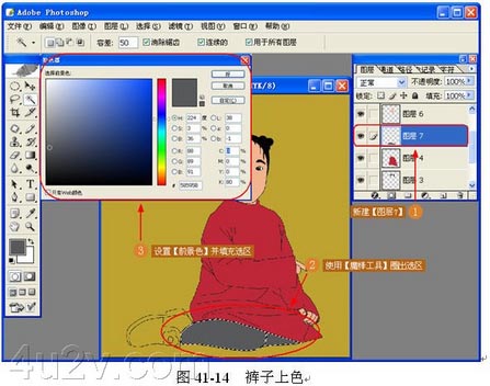(12) 裤子上色。使用【魔棒工具】圈选出腿部选区,设置【前景色】并填充选区,如图 41-14 所示。
