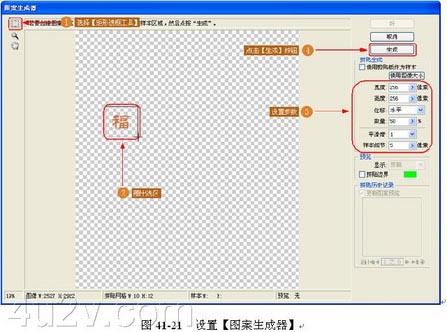 (19) 设置【图案生成器】。【图案生成器】有自动生成一些不规则图案的功能,用它来做衣服的花纹最合适。在【图案生成器】的对话框中选择【矩形选框工具】,圈出一个要生成图案的选区,设置其参数,点击【生成】按钮生成图案,如图 41-21 所示。