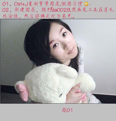 2、新建一个图层,把前景颜色设置为:#da0029,选择画笔工具在人物的眉毛上涂抹,涂好后把图层混合模式改为“柔光”。