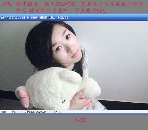 3、新建一个图层,把前景颜色设置为:#224f96,选择画笔工具在人物的眼睛上涂抹,涂好后把图层混合模式改为“叠加”,图层不透明度改为:50%。