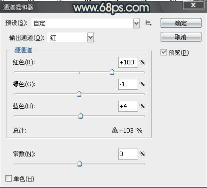 1:打开图片复制一层,因为照片偏黄。所以就先创建通道混合器调整图鞥。参数设置如图1-3,效果如图4: