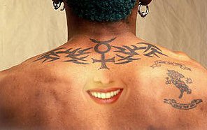 保持两者的绘图方式及笔刷不变,接下来再在以下两张图之间复制嘴唇和纹身。第1、3图为仿制图章制作,第2、4为修复画笔制作。在这两个例子中两者的差距就相当明显了。更改了绘图方式的仿制图章工具很容易造成与采样区图像颜色不符甚至是大相径庭的情况。较为生硬。而修复画笔工具制作的效果过渡柔和并且与采样区域的颜色相差无几。