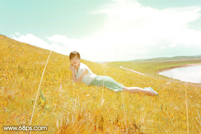 素材图片以比较暗的绿色为主,人物有点背光。处理的时候可以把绿色转为较淡的橙黄色,并把人物调亮,再调整一下天空颜色即可。