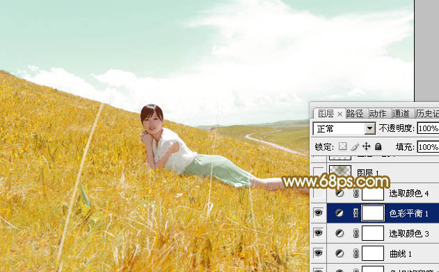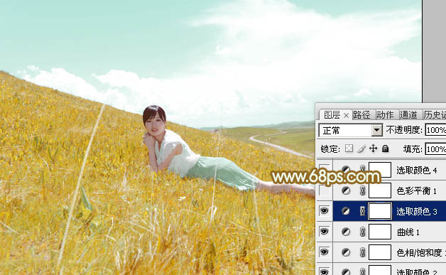 Photoshop给草坡上的美女加上小清新的青黄色(5)