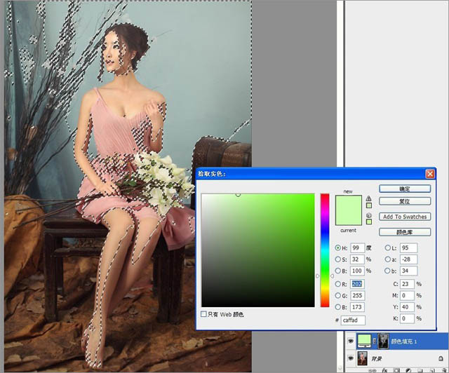 2、打开"选择/色彩范围",选取高光部分,添加"颜色填充"图层,选择一个淡绿色,参数见下图,用绿色给高光部位进行填充,然后将图层混合模式调整为"线性减淡",调整图层不透明为33%,让景与人融合的更加自然。