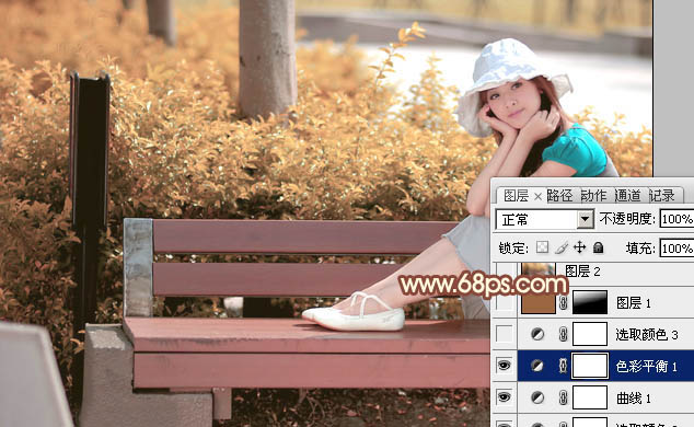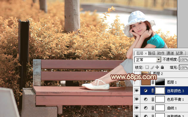 Photoshop给长凳上的美女加上柔美的红褐色(4)