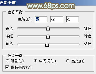 6、创建色彩平衡调整图层,对阴影、中间调、高光进行调整,参数设置如图21 - 23,效果如图24。这一步给图片增加橙黄色。