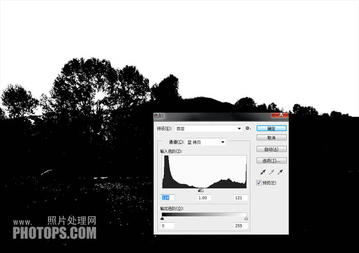 单击“蓝”通道并复制一个“蓝通道”副本。然后按Ctrl+L执行“色阶”命令,调节参数如图,调后图像变为黑白二色图。