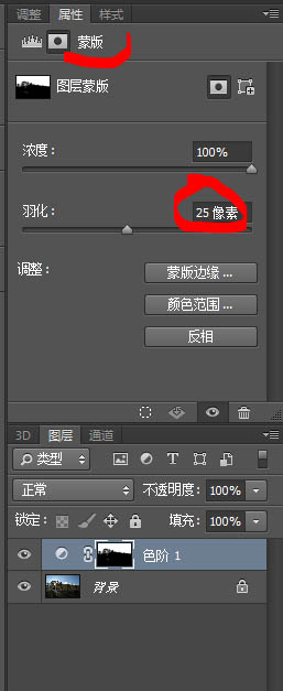 6、单击“调整”后面的“蒙版’面板。将“羽化”调节到25PX。这样选区就会柔化地过度了。天空与树叶就得到很好的过渡。