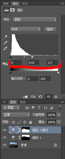 7、由于调整天空和地面需要的蒙版刚好相反,所以可以按Ctrl+J复制出一个同样的“色阶”调整层,然后按Ctrl+I将蒙版反转。调节参数如图。