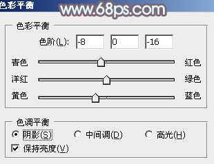 4、创建色彩平衡调整图层,对阴影,高光进行调整,参数设置如图14,15,确定后把图层不透明度改为:30%,效果如图16。这一步微调图片暗部及高光部分的颜色。