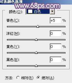 5、创建可选颜色调整图层,对白,黑进行调整,参数及效果如下图。这一步微调图片高光及暗部颜色。