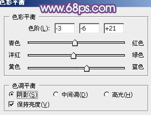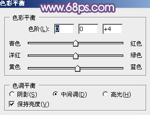 4、创建色彩平衡调整图层,对阴影、中间调、高光进行调整,参数设置如图10 - 12,效果如图13。这一步主要给图片的暗部及中间调部分增加蓝色。