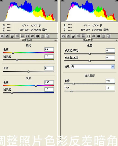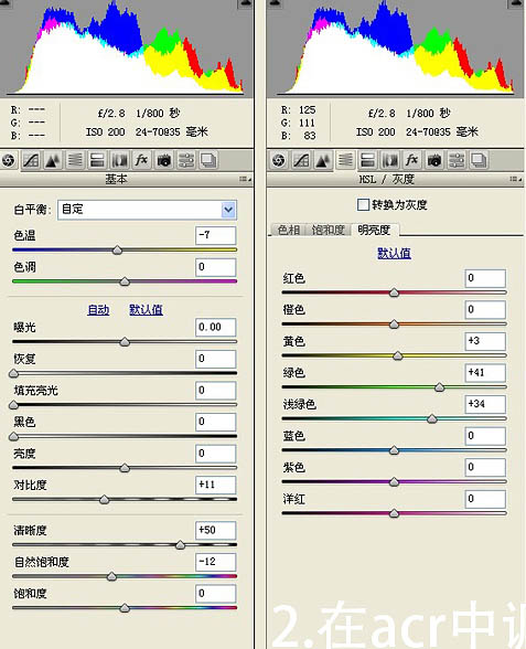 2、在ACR中调整照片色彩反差暗角。