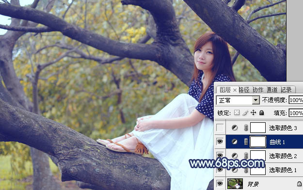 Photoshop给坐树枝上的美女加上小清新的蓝黄色