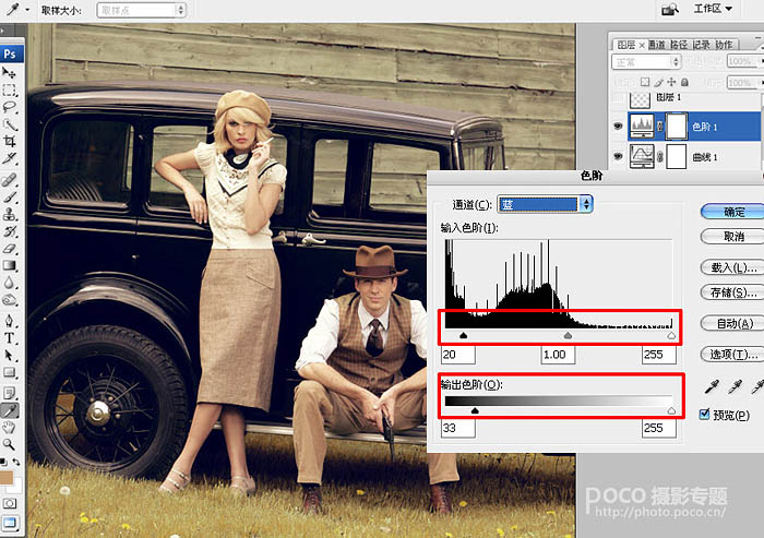 11、执行调整图层-色阶-通道-蓝,适当调整画面的色彩。
