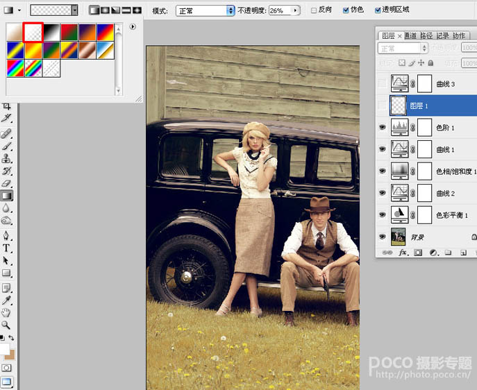 13、选择线性渐变,模式:正常。不透明度为26%。在图片的右上角适当拉出渐变色。效果如图所示。