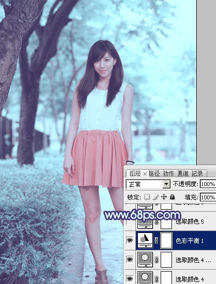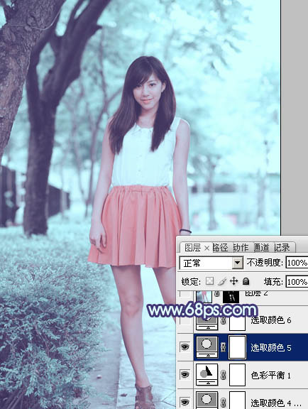 Photoshop给绿树边的美女加上甜美的淡调青蓝色(4)