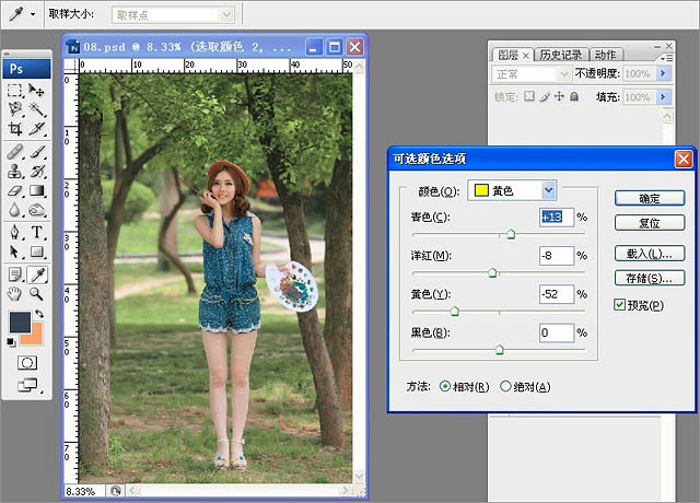 4、为了使整体画面更加符合夏日的清爽味道,我们打开“可选颜色”工具,选择“黄色”,调整参数为:青色+13、洋红-8、黄色-52。此步骤主要将照片里的部分黄色成分抽去,让照片色调清新、干净。