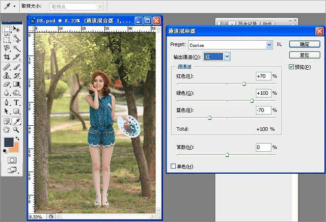 6、接下来营造画面的整体色彩基调。选择“通道混合器”,输出通道选择“红”,源通道参数设置为:红色+70、绿色+100、蓝色-70,这一调整使片子中的绿色更趋近与黄。