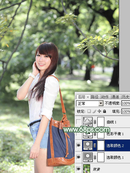 Photoshop给绿树边的美女加上唯美的淡绿色