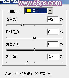 1、打开素材图片,先来调整背景部分的颜色。创建可选颜色调整图层,对黄,绿进行调整,参数及效果如下图。这一步把草地颜色调淡,并增加暖色。