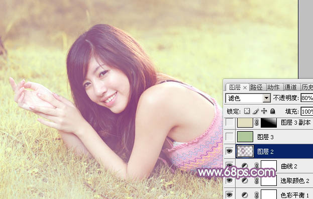Photoshop给绿草上的美女加上唯美的黄紫色