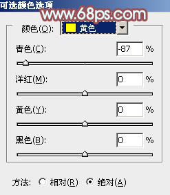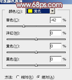 2、创建可选颜色调整图层,对黄色进行调整,参数及效果如下图。这一步同样给图片增加暖色。