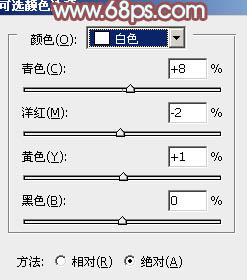 6、创建可选颜色调整图层,对红、黄、绿、白进行调整,参数设置如图10 - 13,效果如图14。这一步给图片增加红色,高光部分增加淡青色。